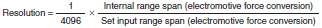 | Resolution | 1/4,096 (of internal range full span) As shown in the following equation, the resolution depends on the ratio of the internal range span to the set input range span. ![]() | ||