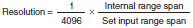 | Resolution | 1/4,096 (of internal range full span) As shown in the following equation, the resolution depends on the ratio of the selected internal range (0 to 4) span to the set input range span. ![]() | ||